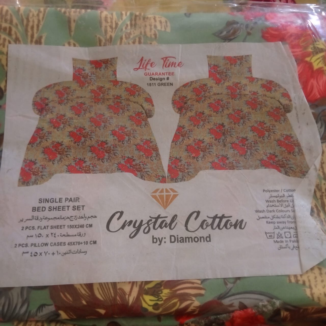Crystal Cotton Double Bed Sheet – Green 1511 by Diamond. Elegant floral design, durable cotton blend fabric, includes 2 matching pillowcases.